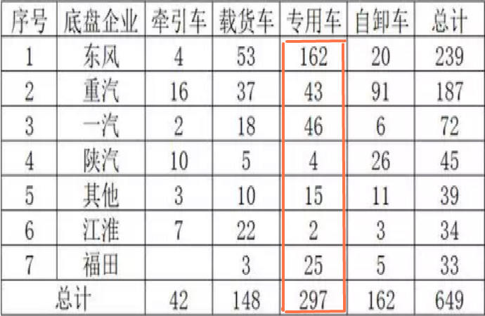 橫向比較幾款整車可以發(fā)現(xiàn),牽引、載貨、自卸大多為主機廠自己申報,而國六專用車產(chǎn)品多為改裝廠申報,所以是“兵家必爭之地”。