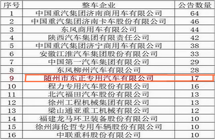 對于整車公告而言,本批國六重卡公告數(shù)量10個以上的企業(yè),共計16家,主機廠占據(jù)主流,重汽濟南商用車、重汽濟南卡車東風(fēng)商用車公司分列前三名。改裝廠中,隨州東正汽車排名靠前。