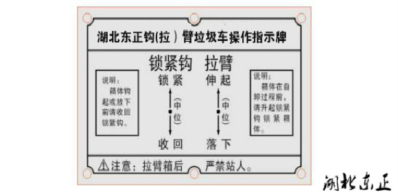 在勾臂式垃圾車裝載垃圾前,空載運(yùn)轉(zhuǎn)達(dá)到 6 個(gè)標(biāo)準(zhǔn)氣壓時(shí),掛上取力器(駕駛室內(nèi)方向盤左下方), 檢查各部件有無(wú)泄漏或異常后,再按照操作指示牌指示位置進(jìn)行操作; 操作手柄指示牌如圖: