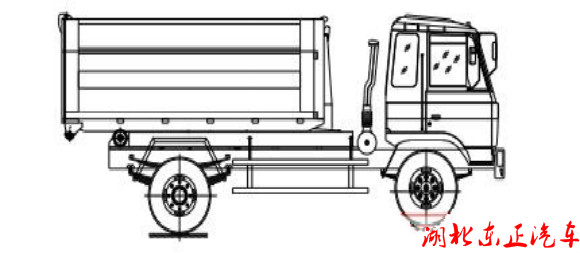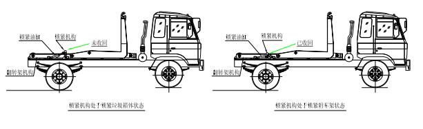 該車是由汽車底盤、拉臂主油缸、附車架、翻轉(zhuǎn)架、支撐腿(選裝)、鎖緊架、鎖緊油缸及多路換向閥等組成。翻轉(zhuǎn)架一端連在附車架上,其另一端設(shè)有活動(dòng)拉臂,中間安裝有 鎖緊系統(tǒng);活動(dòng)臂油缸一端連在活動(dòng)臂上,另一端連接在附車架上;鎖緊機(jī)構(gòu)通過(guò)鎖緊油缸的動(dòng)作可以在箱體自卸時(shí)將附車架上的箱體與翻轉(zhuǎn)架及拉臂連為一體,在主油缸伸出時(shí) 形成自卸角,也可以通過(guò)鎖緊油缸的收回把翻轉(zhuǎn)架與附車架鎖緊為一體,利用主油缸的收回或伸出使活動(dòng)拉臂將地下的垃圾箱拖拉至附車架上或從附車架上放回到地面。
