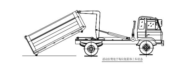 步驟 9. 垃圾箱放置好后,調(diào)整活動(dòng)拉臂鉤與箱體彎鉤位置,使其脫鉤,將拉臂操作手柄推下到落下位置,拉臂油缸收回,活動(dòng)拉臂繞翻轉(zhuǎn)翻轉(zhuǎn)架前鉸鏈軸旋轉(zhuǎn),活動(dòng)拉臂放回到附 車架上,松開(kāi)取力器垃圾箱放置完成,整車可以運(yùn)輸行駛;