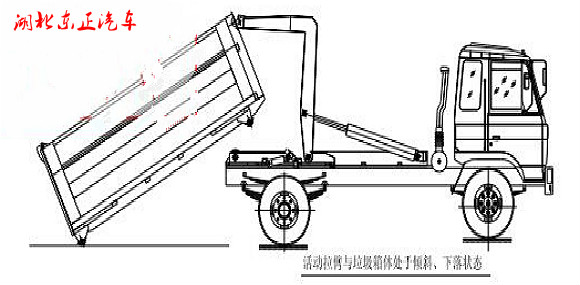 步驟 3.當(dāng)拉臂鉤鉤到箱體彎鉤時(shí),繼續(xù)推下拉臂操作手柄到落下位置,使垃圾箱體繼續(xù)上車(注意:保證垃圾箱體的縱梁位于附車架尾部?jī)珊鬂L輪之間);如圖: